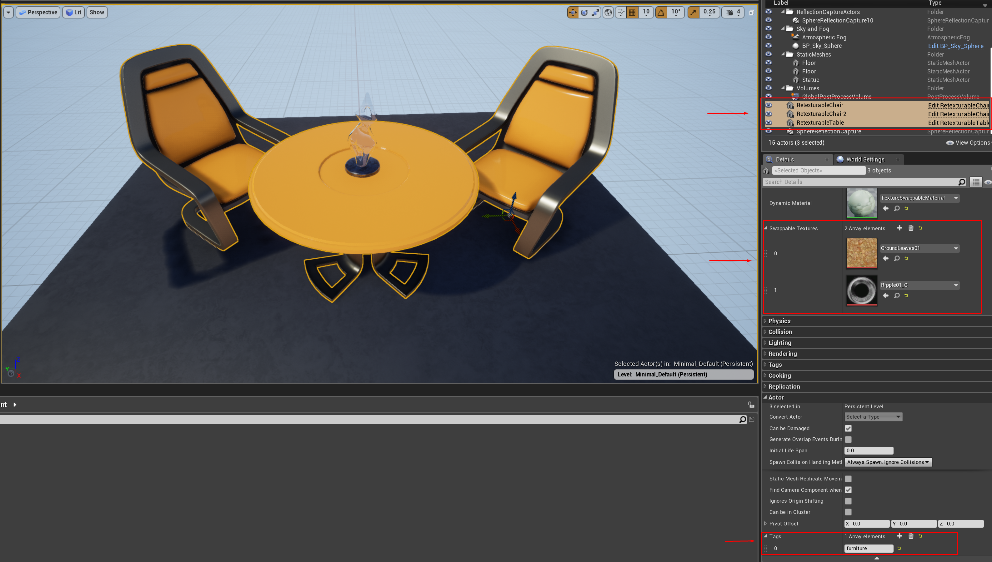 It's easy to set up these groupings by using Unreal Engine's group editing functionality. Select all the instances that should have the same texture selection, and add the textures to all of them simultaneously via the Details panel. Use the same technique to add descriptive tags to groups of actors, which will be used to address them in the API.